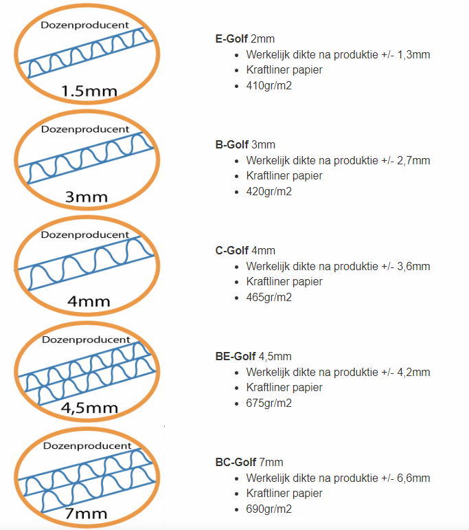 | Kwaliteit geschikt voor | E-Golf 1,5 mm | B-Golf 3 mm | C-Golf 4 mm | BE-Golf 4,5 mm | BC-Golf 7 mm |