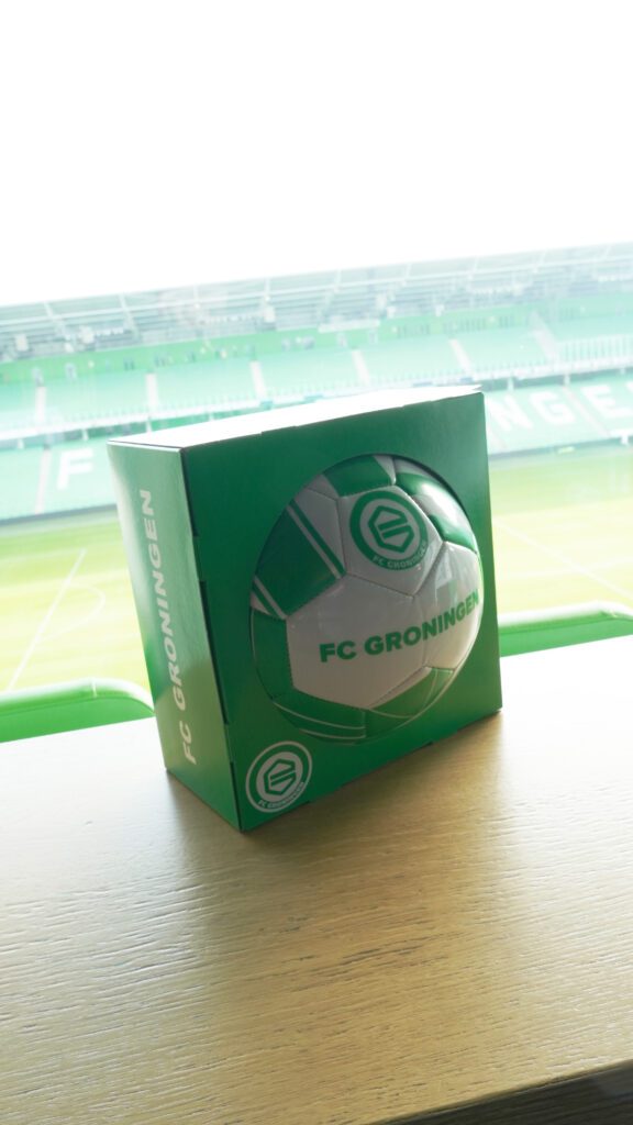 Met een glimlach laat Frits de bekende groene baldoos zien. “Een bal inpakken is misschien wel het moeilijkste wat er is,” vertelt hij. “Daar hebben we samen met Bonsema goed over nagedacht. Het moest stevig zijn, makkelijk te verzenden én natuurlijk herkenbaar als FC Groningen-verpakking. Uiteindelijk is het een mooie, gecacheerd* strakke doos geworden met ons logo erop – praktisch én met uitstraling.” *